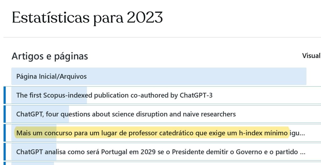 Porém, ontem, um post sobre um concurso para um lugar de catedrático, conseguiu a “proeza” de logo ter saltado para o terceiro lugar dos posts mais vistos de 2023, roubando esse lugar a um post sobre o ChatGPT e ameaçando ainda poder vir a destronar um dos dois primeiros lugares, que também pertencem a dois posts sobre o ChatGPT, vide imagem abaixo.